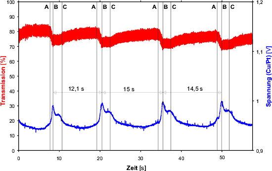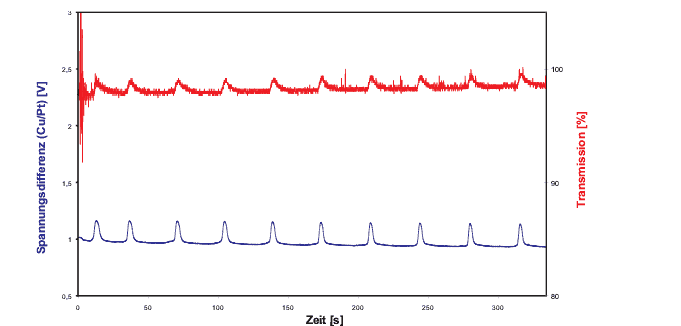 als Elektronenüberträgersystem. Blaue Kurve: Spannungsdifferenz