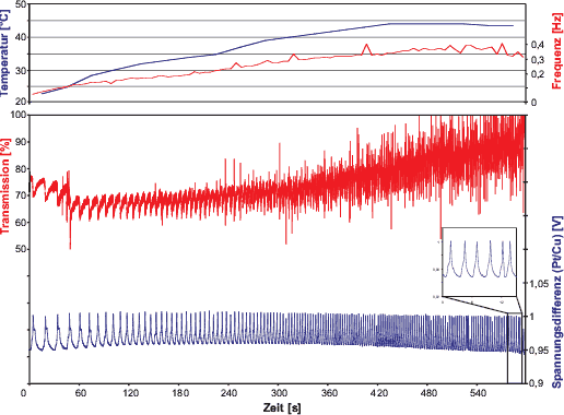 Temperatur (blaue Kurve) und Frequenz (rote Kurve). Unten: Transmission