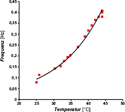 Trägt man die Frequenz (als Maß für die RG) gegen die Temperatur