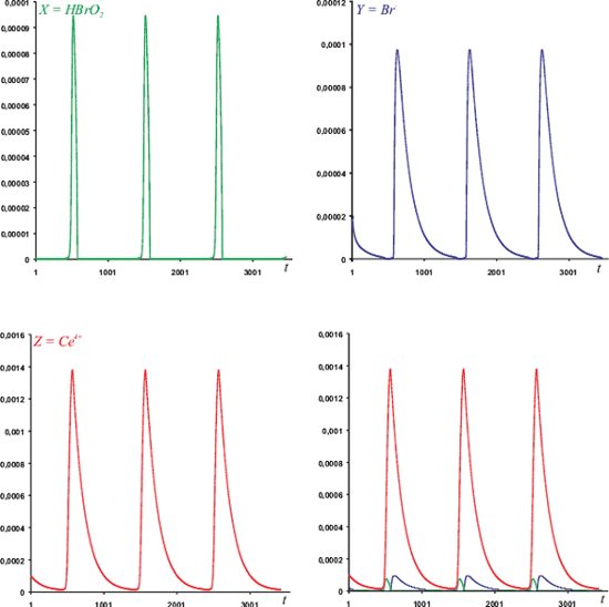 Bei diesem Modell handelt es sich um ein drei-Variablen-System mit den oszillierenden Bestandteilen X ( HBrO2), Y (Br-) und Z ( Ce4+). Dieses Modell ist viel stärker an der BZR orientiert, als der Brüsselator. Aus dem obigen Reaktionsgleichungen ergibt sich analog zum letzten Kapitel folgendes DGS: Wie man sieht, handelt es sich wieder um ein Fließgleichgewicht, weil A und B während der gesamten Simulation konstant gehalten werden. Setzt man dieses DGS in ein Programm um, wie es im letzten Kapitel beschrieben wurde, so erhält man Kurven, wie Abbildung 15 sie zeigt. Der Vergleich mit den Messergebnissen erfolgt wieder in Kapitel 3.2.4. ![]() Abb. 15: Funktionsgraphen des FKN-Modells mit den Paramtern: A0=0,06; B0=0,02; X0 = 2*10-7; Y0 = 2*10-5; Z0 = 1*10-4; f=1,5; k1=1,28; k2=8,0; k3 = 8,0*105; k4=2*103; k5 = 1,0 und ![]()