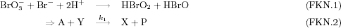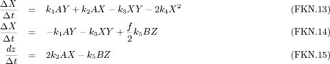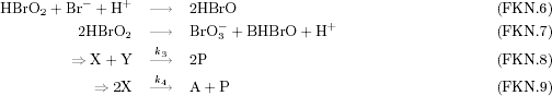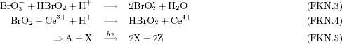 ![]() ![]() ![]() 3.2.2 Das Modell von FIELD, KÖRÖS und NOYES (FKN-Modell)RICHARD J. FIELD, ENDRE KÖRÖS und RICHARD M. NOYES haben ein anderes Modell für den Ablauf der BZR entworfen, als dasjenige, das in 2.2 beschrieben wurde. Es eignet sich sehr gut dazu ein DGS, wie es im letzten Abschnitt beschrieben wurde, zu gewinnen. Sie geben das folgende Modell an. Unter den chemischen Gleichungen stehen jeweils die vereinfachten Gleichungen des Modells, die sich daraus ergeben [Kondepudi, Prigogine 1998].