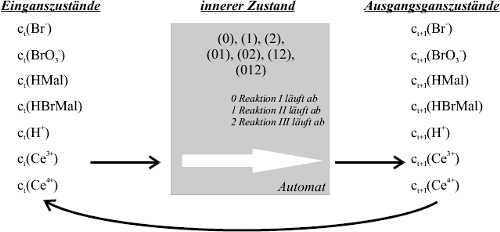 ![]() ![]() ![]() 3.2.3 Ein eigenes ModellDer folgende Teil beschreibt ein Modell, das ich selber entwickelt habe. Es simuliert einen etwas anderen Aspekt der BZR. Die beiden ersten Modelle (Brüsselator und FKN) bilden thermodynamisch offene Fließgleichgewichtssysteme nach. Im Idealversuch wird die BZR auch so durchgeführt. Wegen des großen apparativen Aufwands, der zur Herstellung eines Fließgleichgewichtes erforderlich wäre (Durchflussreaktor ...) habe ich sie allerdings in einem geschlossenen System (Becherglas) angesetzt. Indem man die Konzentrationen der Edukte im Vergleich zu der des Katalysators Ce3+ sehr hoch ansetzt, kommt man hier einem Fließgleichgewicht sehr nahe. Dabei werden durch die geringe Konzentration des Katalysators immer nur sehr kleine Stoffportionen umgesetzt. Nun war die Frage interessant, ob man auch ein Modell entwickeln könnte, das ein solches geschlossenes System simuliert. Meine ersten Versuche, bei denen ich die schon vorgestellten Modelle einfach um Gleichungen für die Änderung der Edukt- und Produktkonzentrationen erweitert habe, hatten keinen Erfolg. Die Systeme näherten sich immer ohne Oszillation dem Gleichgewichtszustand an.Ich habe dann einen ganz anderen Ansatz zur Simulation verwendet. Wie im ersten Teil der Arbeit beschrieben, kann man die BZR so erklären, dass mehrere Reaktionen gleichzeitig ablaufen (Reaktionsgleichungen I-II). Von diesen wird Reaktion (II) durch Bromid-Ionen inhibiert, die in Reaktion (I) abgebaut und in Reaktion (III) rückgebildet werden. Dieses Konzept habe ich nun in ein Simulationsmodell umgewandelt. Nur die Produktion von HCOOH und CO2 wird nicht mitsimuliert. Ich habe um den oben beschriebenen Mechanismus für die BZR einen sog. Automaten aufgebaut. Ein Automat ist ein theroretisches Gebilde der Informatik. Er ist eine Art Black-Box, die eine Reihe von Eingangszuständen in eine Reihe von Ausgangszuständen wandelt. Dabei besitzt ein Automat einen inneren Zustand, der angibt, wie die Eingangszustände zu verarbeiten sind. Am Ende jeder Verarbeitung geht dann der Automat in einen neuen inneren Zustand über, oder bleibt im aktuellen [Mittelbach 1997]. Der Automat, den ich verwende hat die Stoffmengen zur Zeit t als Eingangszustände und gibt die neuen Stoffmengen zur Zeit t+1 aus. Sein innerer Zustand gibt jeweils an, ob Reaktion (I), (II) oder (III) gerade abläuft. Es sind auch Kombinationen der Reaktionen möglich. Der Automat ersetzt also im in 3.2.1 beschriebenen Grundprogramm das DGS. Seinen Aufbau zeigt Abbildung 16.
