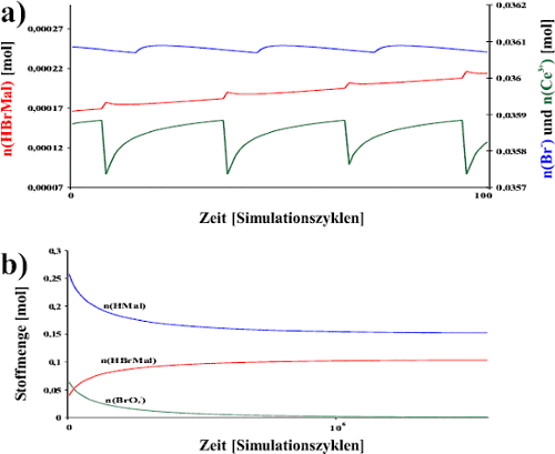 zeigt den Verlauf von drei Oszillationsperioden. Es sind die Stoffmengen