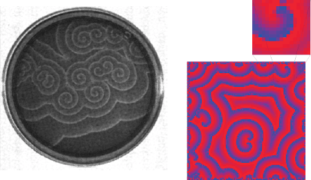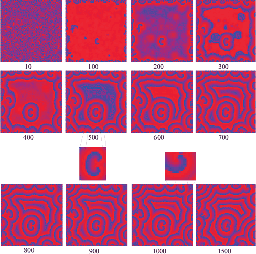 Auf dem ersten Bild (10. Generation) sieht man den zufälligen Ausgangszustand des ZA. Auf den folgenden Bildern entstehen dann stabile Spiralenmuster. Der Rand wirkt aufgrund der Randbedingungen ebenfalls als Störzentrum. Von ihm gehen konzentrische Kreiswellen aus. Treffen zwei Wellenfronten aufeinander, so löschen sie sich gegenseitig aus. Die Farbgebung wurde in Anlehnung an das Experiment mit Ferroin/Ferriin gewählt.