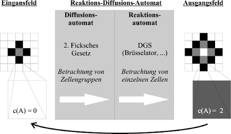 ![]() ![]() ![]() 3.3.2 Die Theorie zellulärer AutomatenZur Lösung des eben angegebenen DGS wird wieder ein iteratives Verfahren verwendet. Allerdings spielt sich die Simulation in einem zellulären Automaten (ZA) ab. Ein ZA ist ein Automat, der als Eingangszustand ein Feld von Zellen (1,2,3,...n-dimensional) in unterschiedlichen Zuständen hat und ein ebensolches ausgibt. Jede Zelle entspricht dabei einem Raumpunkt. Man kann sich z.B. ein solches zweidimensionales Feld wie ein Schachbrett vorstellen. Jedes Quadrat dieses Schachbrettes (eine Zelle) enthält die dortigen Konzentrationen der beteiligten Stoffe und wird über seine zwei Koordinaten angesprochen. Der Automat ändert nun diese Konzentrationen, indem er das Reaktions-Diffusions-System auf jedes Feld anwendet. Pro Zeiteinheit ändern sich also die Konzentrationen jeder Zelle genau einmal (durch Diffusion und Reaktion). Wurden alle Zellen bearbeitet, so wird das nun erzeugte neue Feld wieder als Eingangsfeld dem Automaten zugeführt (Iteration). Als Startfeld (t=0) wird eine zufällige Konzentrationsverteilung auf dem Feld eingesetzt [Weimar 1997]. Abbildung 19 verdeutlicht dieses noch einmal.