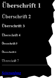 unit html10: BeispielHTMOpen('c:\temp\test.html', 'Testdatei', black, silver); //neue HTML-datei anlegenHTMDefAnchor('top'); HTMHeading('1', 'Überschrift 1');//Überschriften schreiben HTMHeading('2', 'Überschrift 2'); HTMHeading('3', 'Überschrift 3'); HTMHeading('4', 'Überschrift 4'); HTMHeading('5', 'Überschrift 5'); HTMHeading('6', 'Überschrift 6'); HTMHeading('7', 'Überschrift 7'); HTMLine(100, 1, true, alCenter, false); //<hr>, 100% Länge, 1 Pixel Höhe, zentriert, kein Schatten HTMWriteLnLink('#top', 'Seitenanfang', alLeft, [italic,bold]); HTMClose; //HTML-datei schließen erzeugt folgendes Ergebnis: